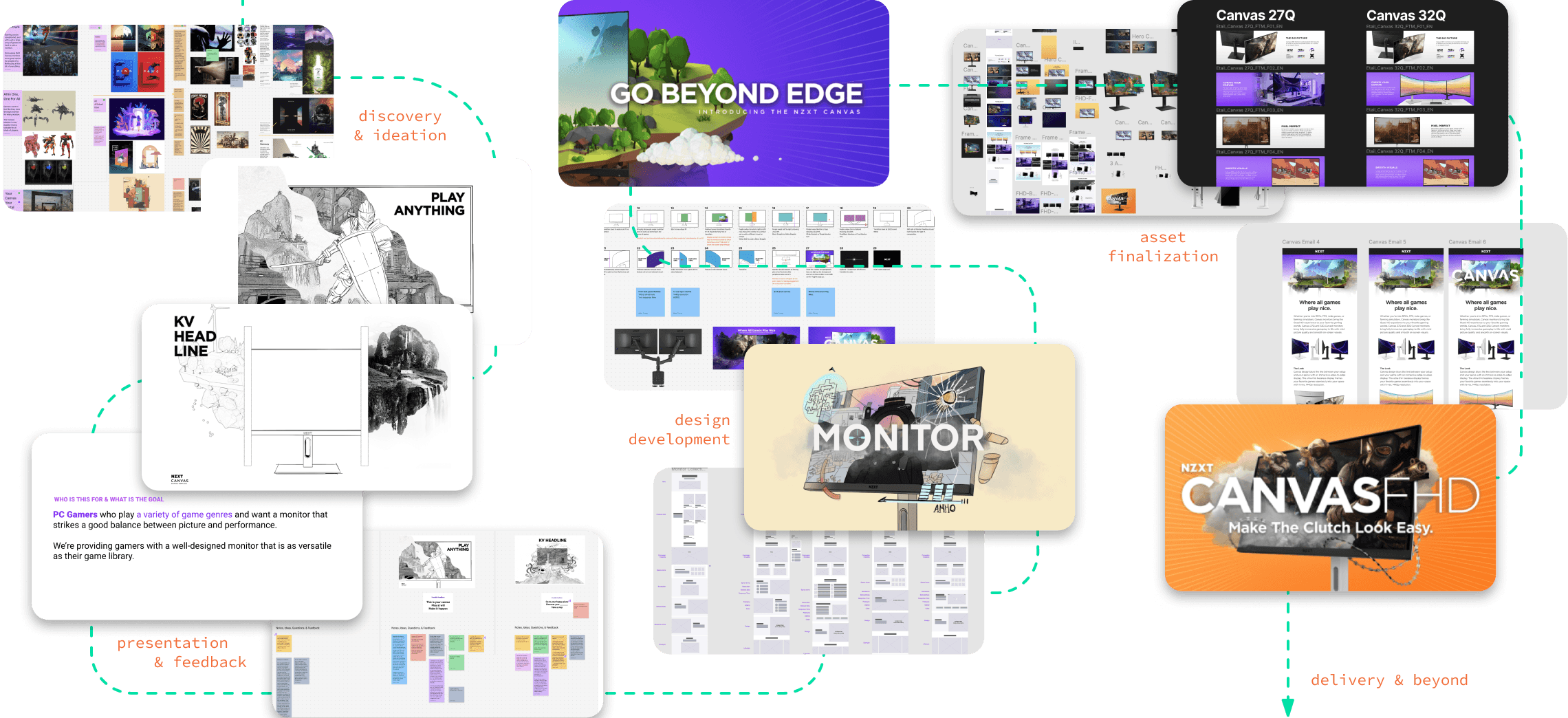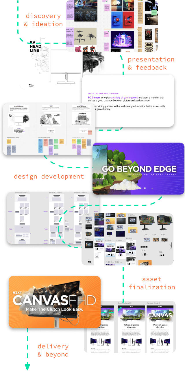 The Canvas QHD and FHD marked NZXT’s entry into the monitor market. To align this campaign with the brand's vision of making PC gaming accessible to everyone, I aimed to clearly communicate each monitor’s key selling points in a way that resonated with gamers. The QHD model was positioned as the ideal balance between performance and picture quality, allowing gamers to seamlessly switch between different game genres and fully immerse themselves—where all games play nice. The FHD model, designed for the competitive gamer, emphasized the importance of every frame per second and refresh rate, ensuring that when you game, the clutch moments feel effortless. Together, these monitors equip gamers to excel in both immersive and fast-paced gaming environments.